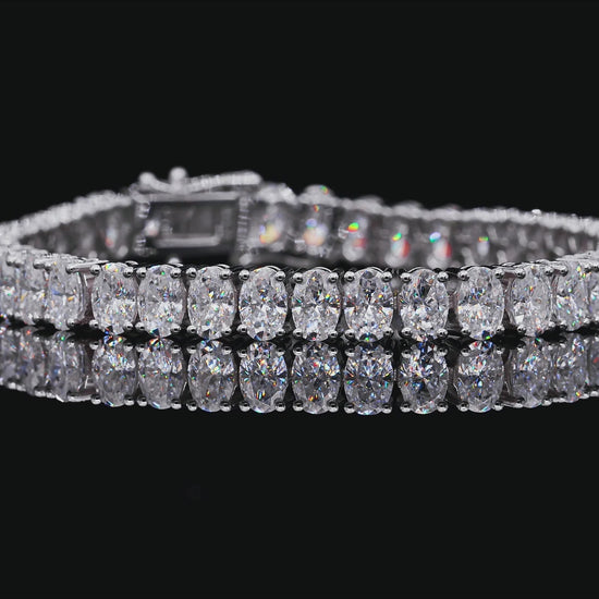 The sterling silver base is enhanced with a layer of white gold plating, which adds a smooth, polished finish, creating a piece that is both durable and captivating. The oval shape of the Moissanite diamonds further enhances the bracelet's allure, giving it a sleek, elongated appearance. Its versatile design makes it ideal for both formal occasions and adding a touch of elegance to everyday wear.